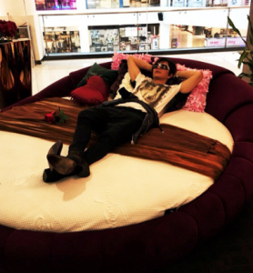 海外のお店のベッドで気持ちよさそうに横になるGACKTさん。