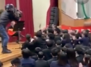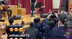 GACKTさんが壇上に上がっても生徒たちは座ったまま。間が空くと大声援。GACKTさんが喋り出すと生徒たちが一気に壇上に駆け寄りました。