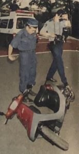 当時、原付バイクで東京都新宿区の安鎮坂付近を走行中、ガードレールに激突し、4メートルも飛ばされ、その後に引きずられ、そのままいびきをかいて倒れていたそうです。