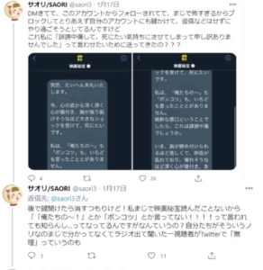 ただ、怖いDMを受け取った女性へ、映画秘宝の会社から直に謝罪があったそうです。