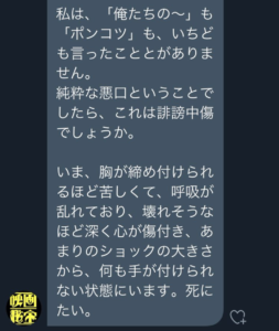 ・「誹謗中傷でしょうか」「死にたいです」どう喝に該当するのはどこだろう。どちらかと言えば、いきなり電話掛けた行為のほうがどう喝に該当しそうな気がする