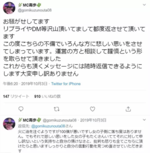 デビュー直後のアイドルに彼女がいたとあって、デビュー前から応援していたファンや、『MC毒歩/どっぽ』のお客様の女性たちからも批判殺到。
