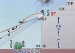 しかし、窪塚さんが飛び降りた後に9m離れたフェンスへの衝突し茂みに落ちて助かったということで、自力で助走をつけて飛んでいたことになるので、他人に落とされた可能性は0です